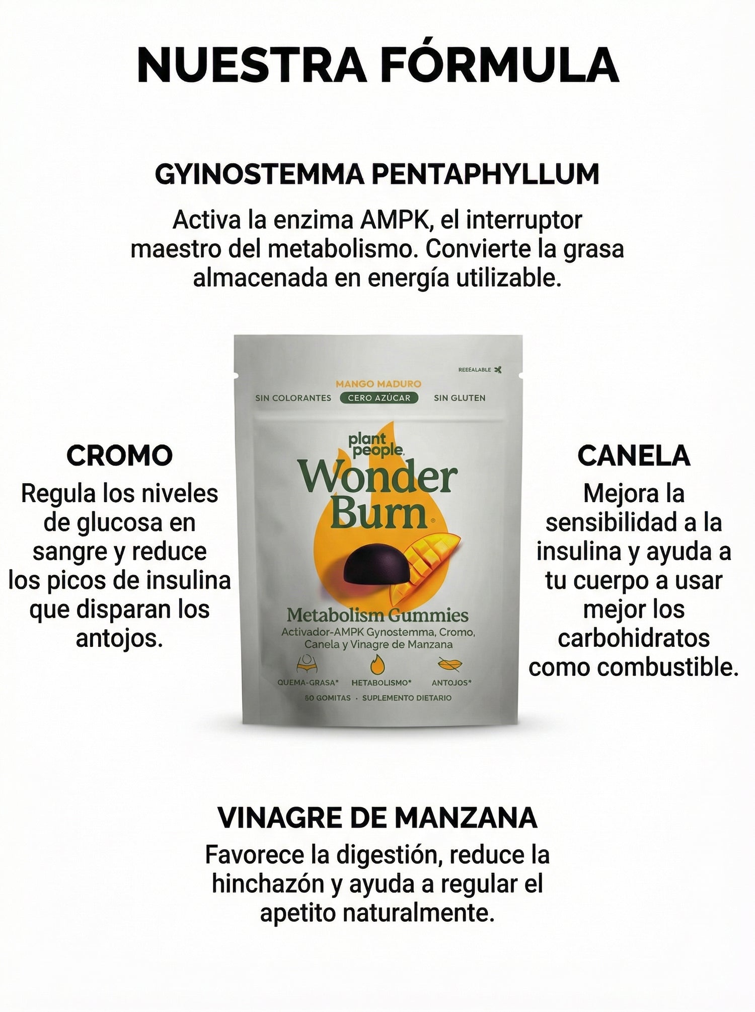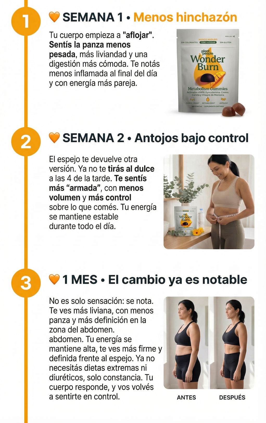 Nuestra fórmula actúa desde adentro, reactivando tu metabolismo naturalmente, eliminando antojos y ayudándote a quemar grasa, especialmente en la zona abdominal.
